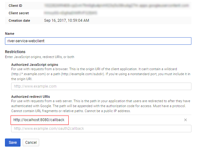 - Add authorized redirect url to http://localhost:8080 (for testing)