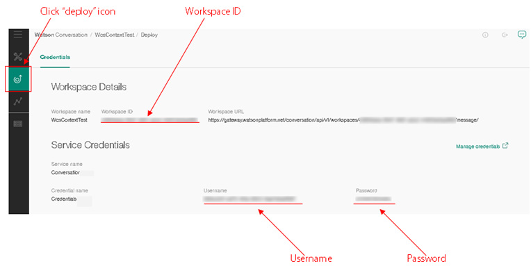 First, set authentication information to access Watson. Edit the following part of the code and replace it with the workspaceId, username, password that we checked in the deploy pane.