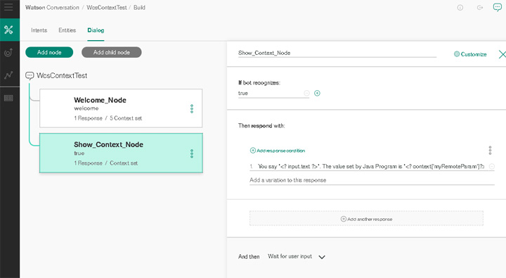 If you use WcsClient#put (user ID, name of context variabl, value of context variable), you can assign a value to Watson's Context variable from the Java logic. I set the value " I need you! " to the Context variable named myRemoteParam here. In fact, the Context variable will be reflected the next time java logic access to Watson.